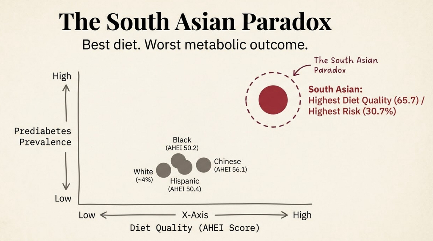 Current ACC/AHA guidelines acknowledge South Asian ancestry as a cardiovascular risk-enhancing factor, but they don’t operationalize what that means for earlier metabolic screening in a way that actually matches this burden. Lp(a), ApoB testing, earlier fasting insulin, HOMA-IR, HbA1c tracked against lower thresholds, none of this is routine. South Asian ancestry is a flag in the guidelines. It hasn’t yet become a protocol.