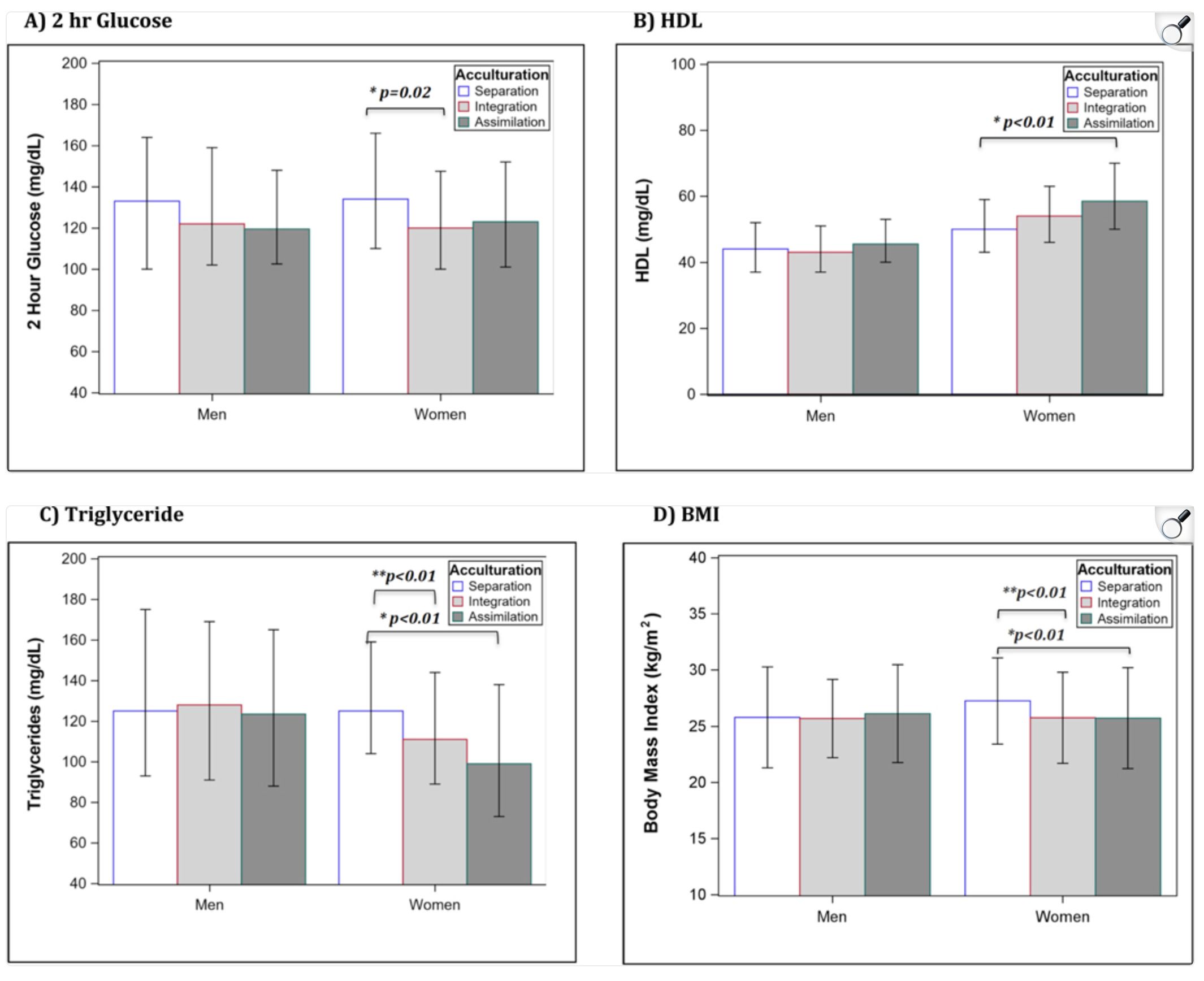 Most middle-aged South Asian adults in the United States are immigrants. Many arrived eating the way people actually eat at home, fried snacks, sweets, high-fat dairy, limited structured exercise. Over years of assimilation, habits shifted. Better diets. More movement. The MASALA study itself found that women who integrated into American culture had more favorable metabolic profiles than those who maintained strict dietary and lifestyle separation (below).