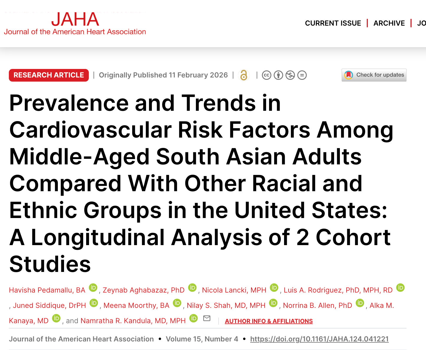 Researchers from Northwestern and UCSF combined two landmark US cohort studies, MASALA (South Asian adults, a study we have referred to many times on this Substack) and MESA (White, Black, Chinese, and Hispanic adults), modeling clinical and behavioral risk factors across repeated exam cycles spanning midlife, from age 45 to 55, using approximately 2,700 participants.