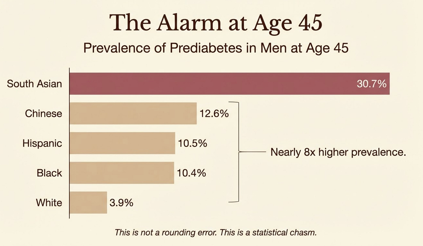 At age 45, South Asian men in the US have a prediabetes prevalence of 30.7% by study criteria (meaning we use fasting glucose between 100–125 mg/dL for everyone in the study).