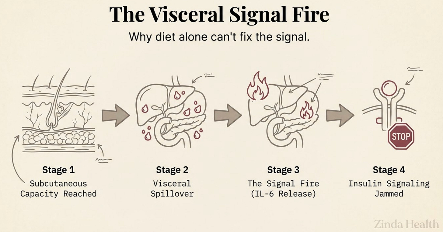 Beta-cell reserve runs smaller from birth, and subcutaneous fat storage saturates earlier. When the overflow goes visceral, into the liver and surrounding organs, the metabolic signal changes entirely. Visceral fat doesn’t just sit there. It behaves like an endocrine organ, pushing inflammatory signaling (IL-6 among others as we discussed here last month), that worsens insulin resistance even when the person eating the meal has the best diet score in the room.