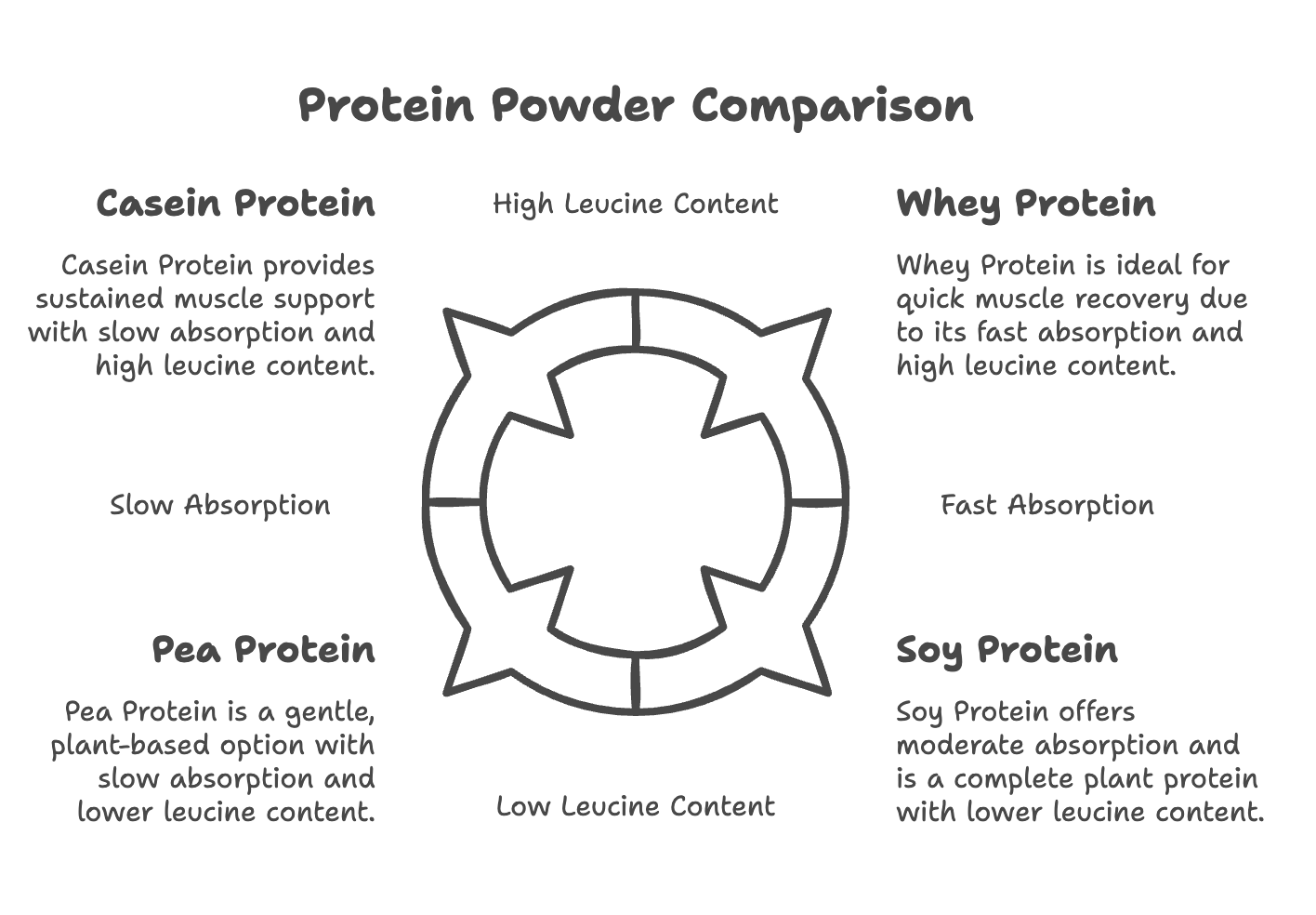 Let’s break down the common types of protein powders and what I learned about each, especially regarding leucine content and absorption, which are key for muscle health: